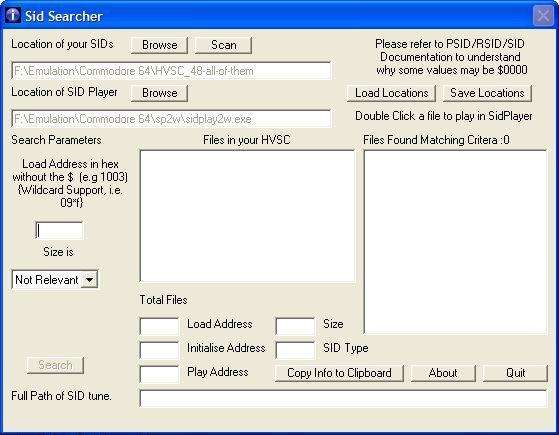Sid Searcher is a little program I decided to write because I needed an application to allow me to search all my SID tunes in HVSC, using their load addresses.  To download, use the download box to the right at the top.